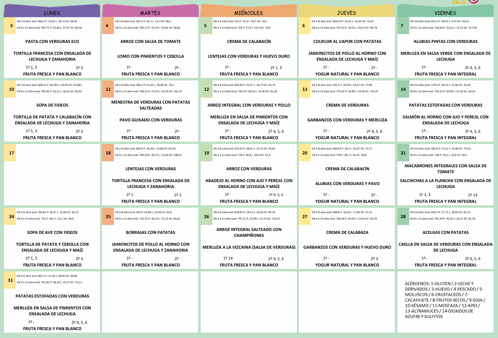 El menú escolar está elaborado y supervisado por un gabinete de nutricionistas, se prepara en nuestras propias cocinas, y está adaptado a las necesidades nutricionales de cada uno de nuestros alumnos.